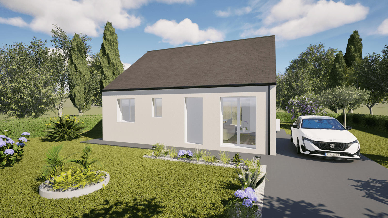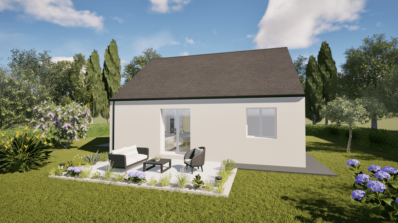 - ×Menuiseries PVC monocolore blanche + 2 baies coulissantes aluminium monocolore blanche de chez Menuiseries Françaises sur les façades "entrée et arrière".