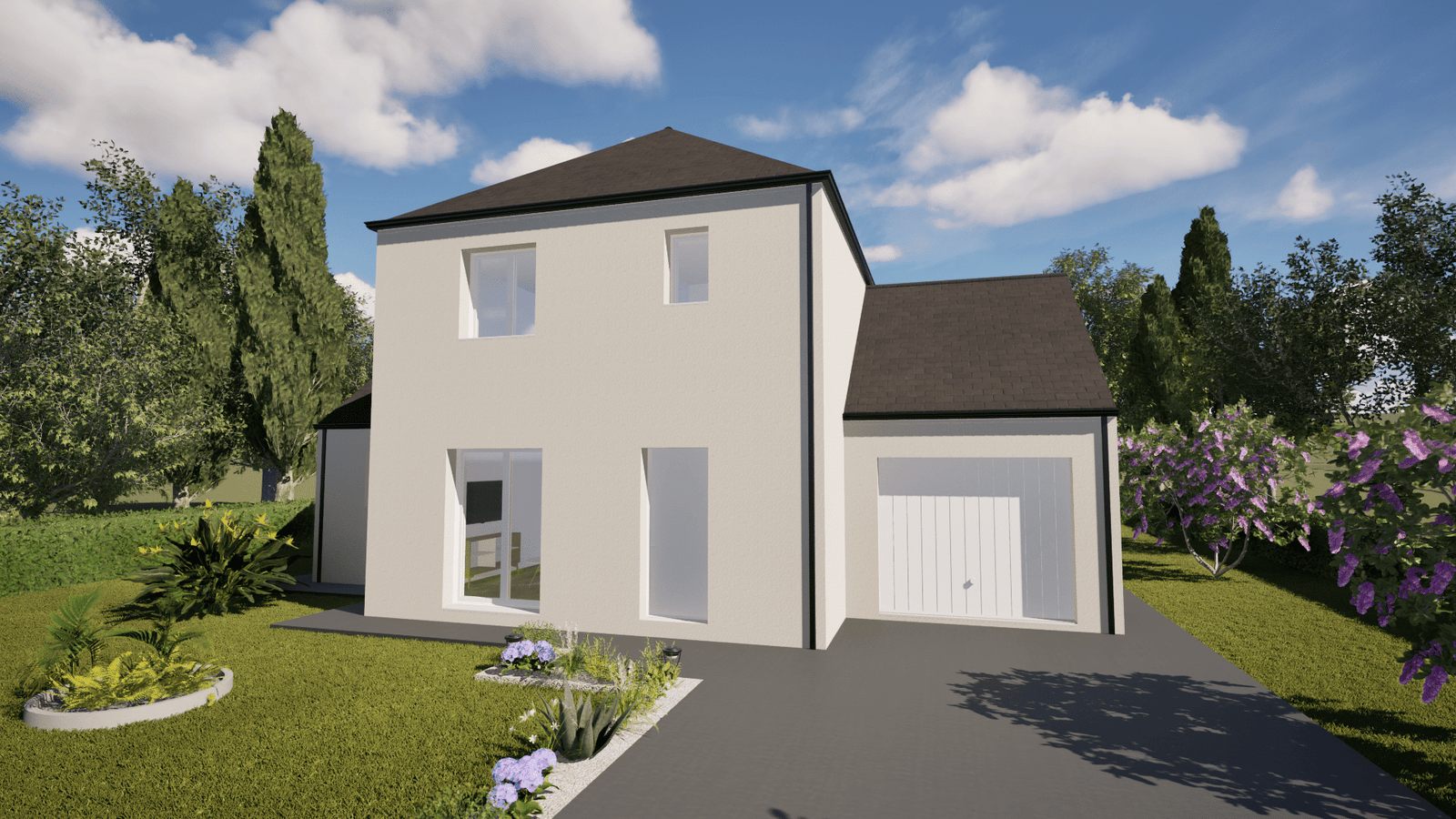 Prix de base sans terrain 163 250 € + Base 163250 € + Porte d'entrée 0 € + Porte de garage 0 € + Menuiseries 0 € + Portes intérieures 0 € + Meuble vasque 0 € + Baignoire - Douche 0 €