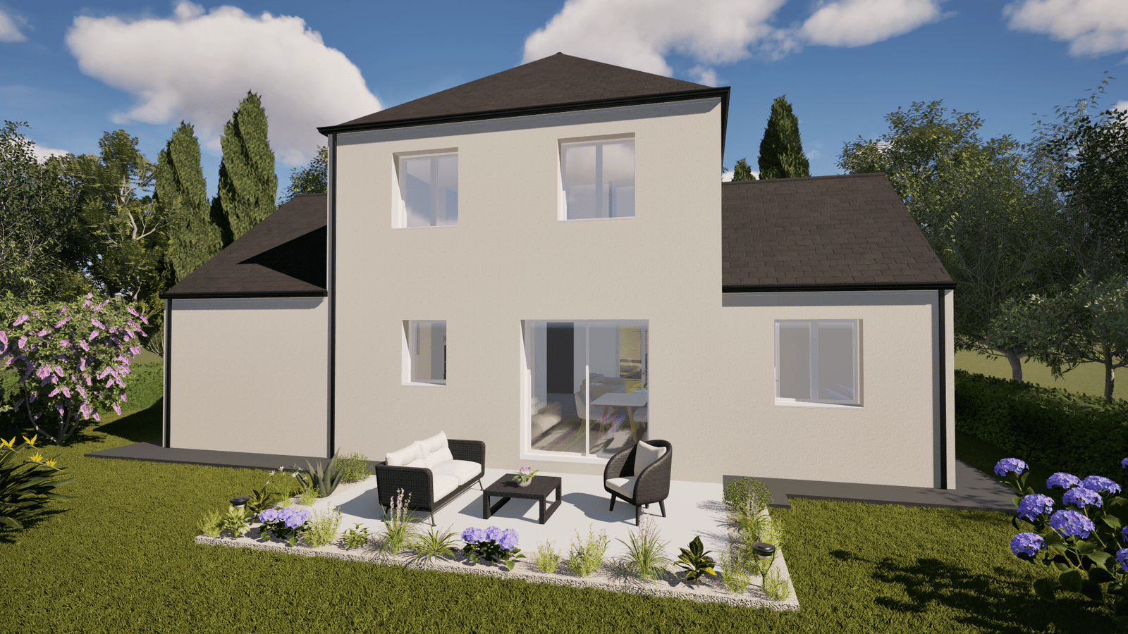 - ×Menuiseries PVC monocolore blanche + 1 baie coulissante aluminium monocolore blanche de largeur 2,00m de chez Menuiseries Françaises sur la façade "entrée".